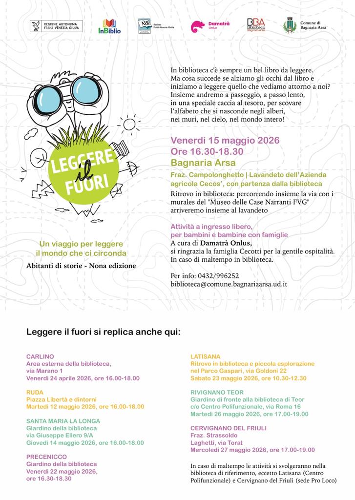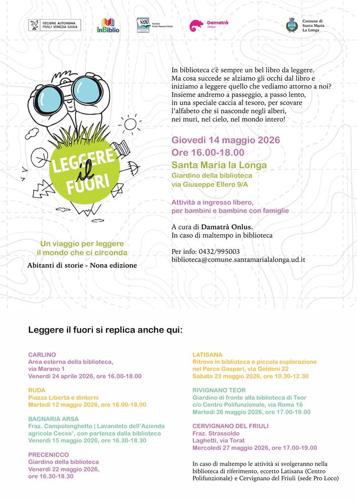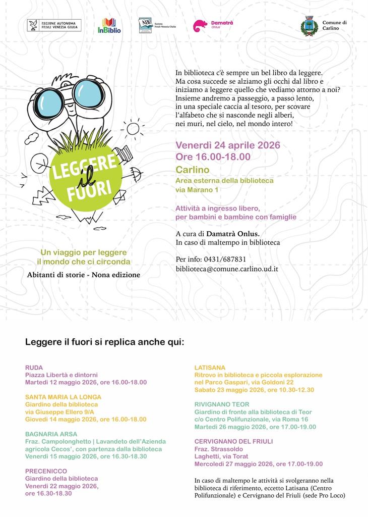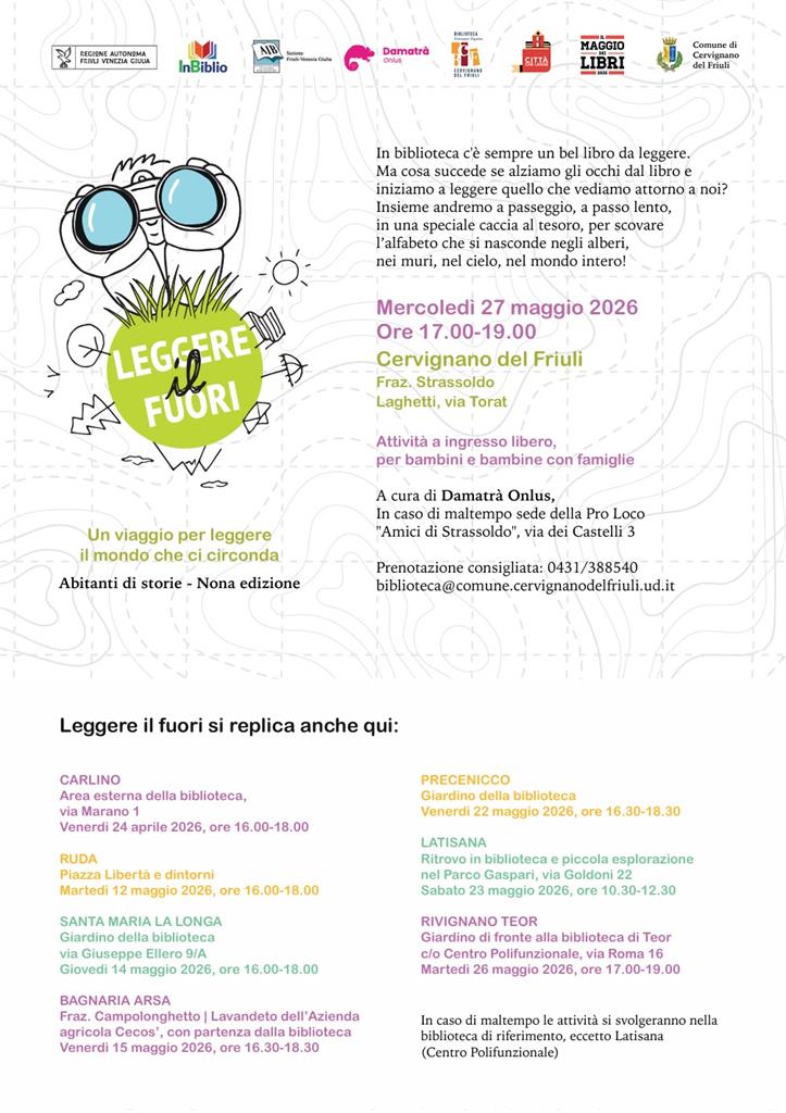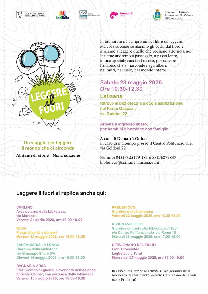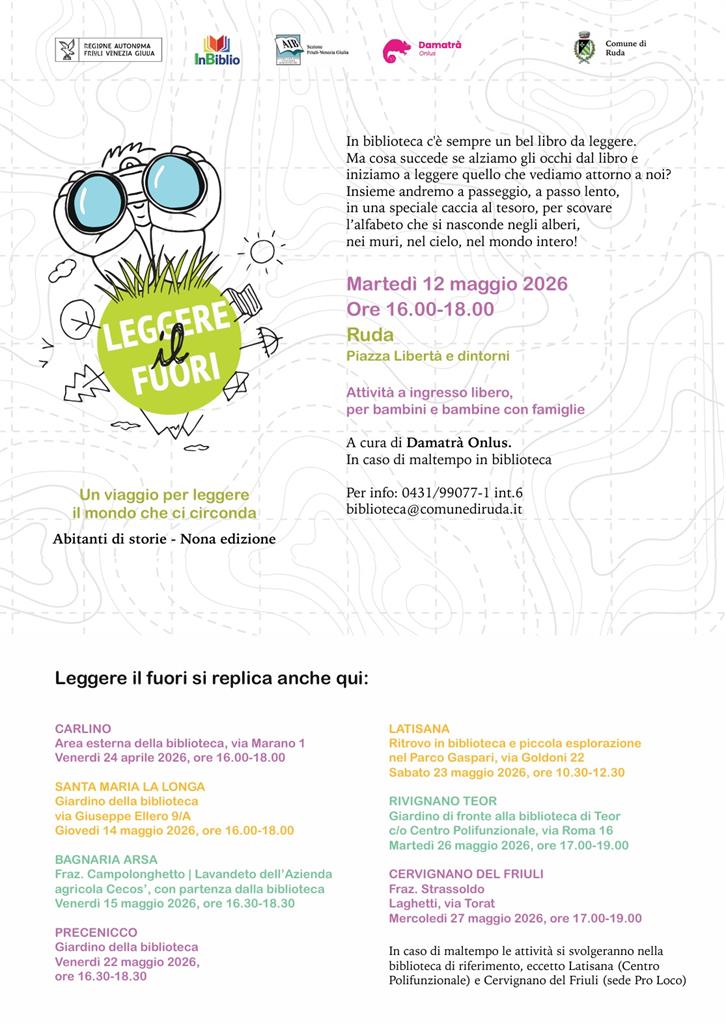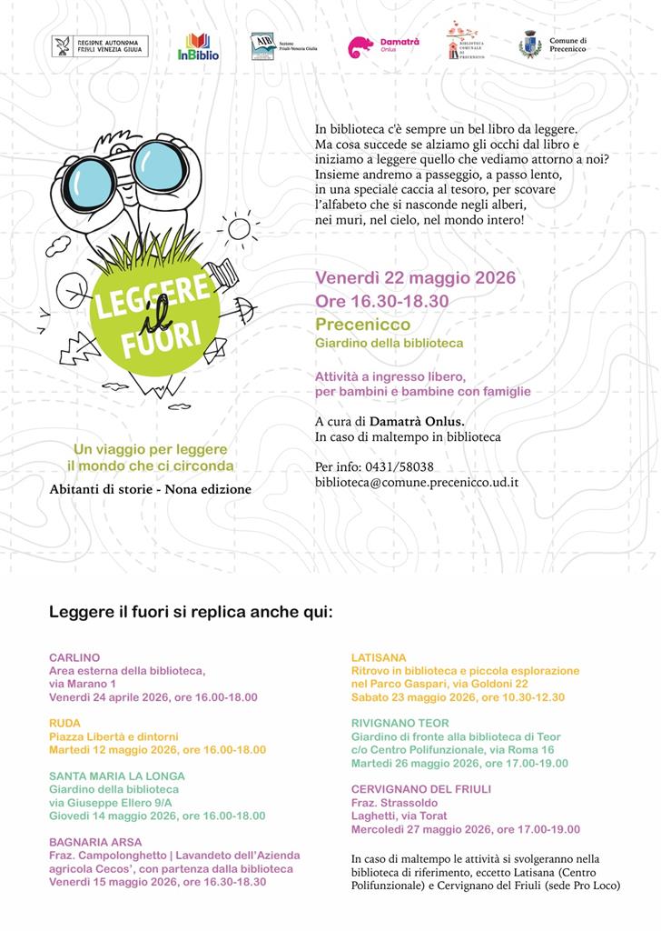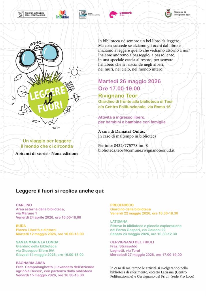 Leggere il fuori rientra nell'attività Abitanti di storie (IX edizione) promossa da InBiblio, in collaborazione con Damatrà, con il patrocinio dell’Associazione Italiana Biblioteche FVG e il sostegno della Regione Autonoma Friuli Venezia Giulia. Grafica e disegni di Emanuele Bertossi. Una galleria fotografica degli incontri e maggiori informazioni sul progetto sono disponibili al seguente link: https://www.inbiblio.it/leggerefuori