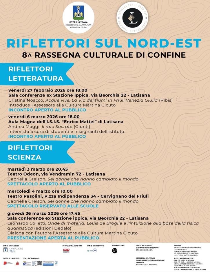 Ottava edizione per "Riflettori sul Nord-Est", la rassegna letteraria di confine che anticipa la 33^ edizione del Premio Letterario Internazionale “Latisana per il Nord-Est”, valorizzando gli autori e i libri ambientati al confine con una serie di incontri che ampliano ulteriormente la conoscenza e la diffusione del panorama letterario transfrontaliero.